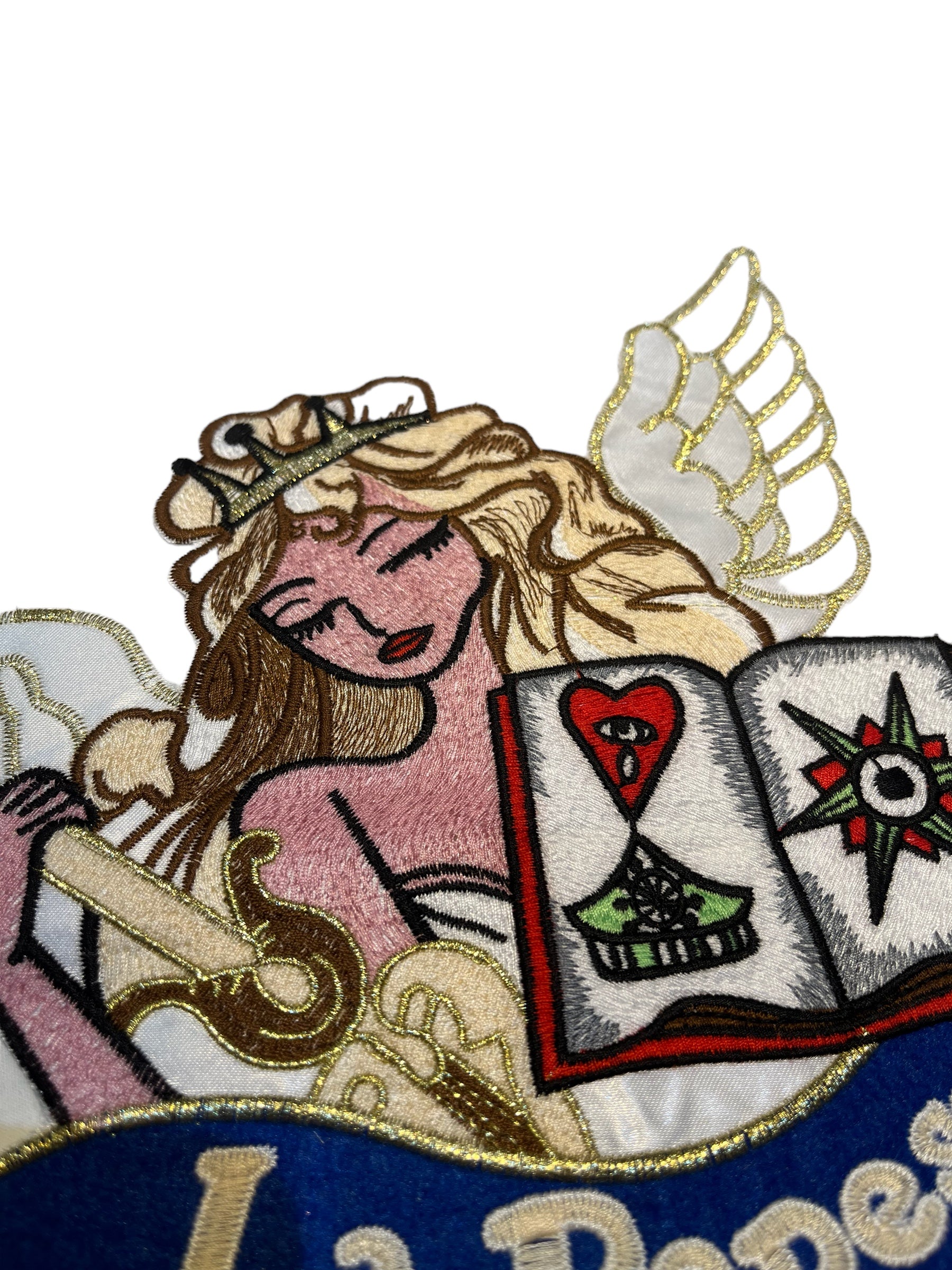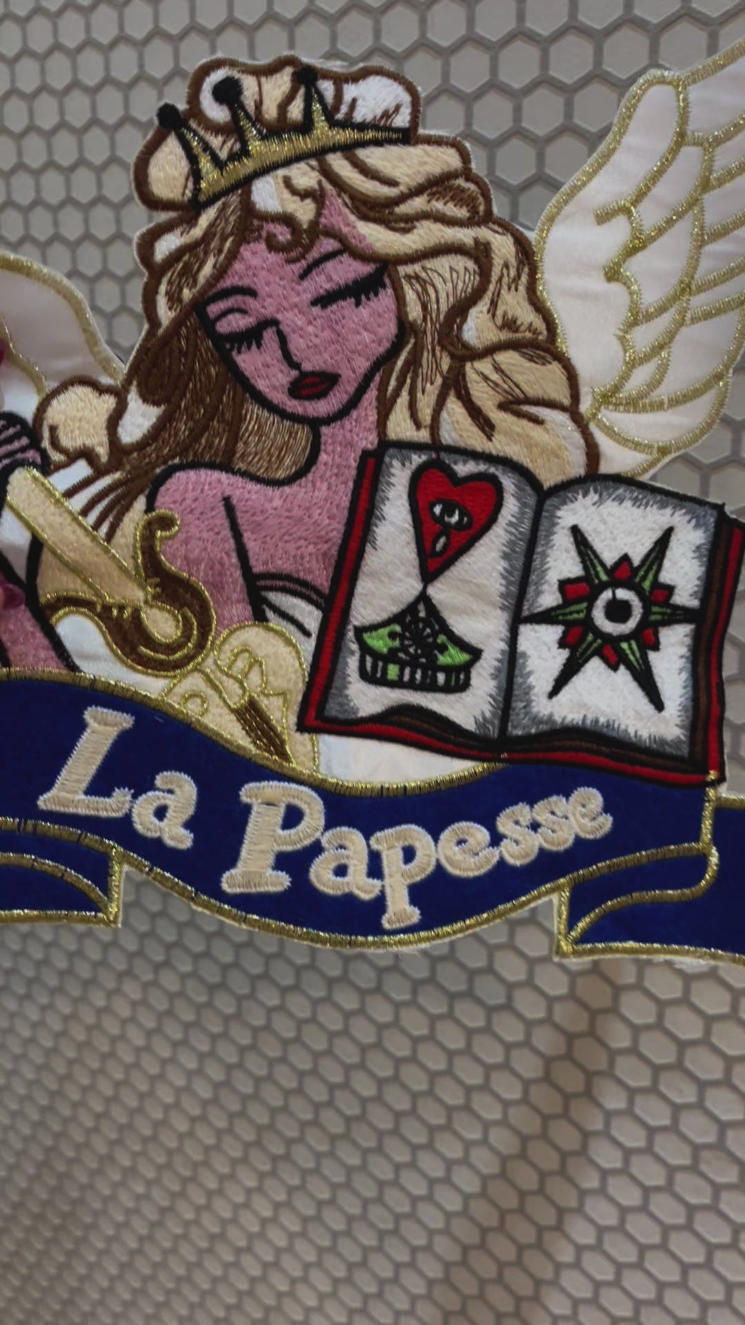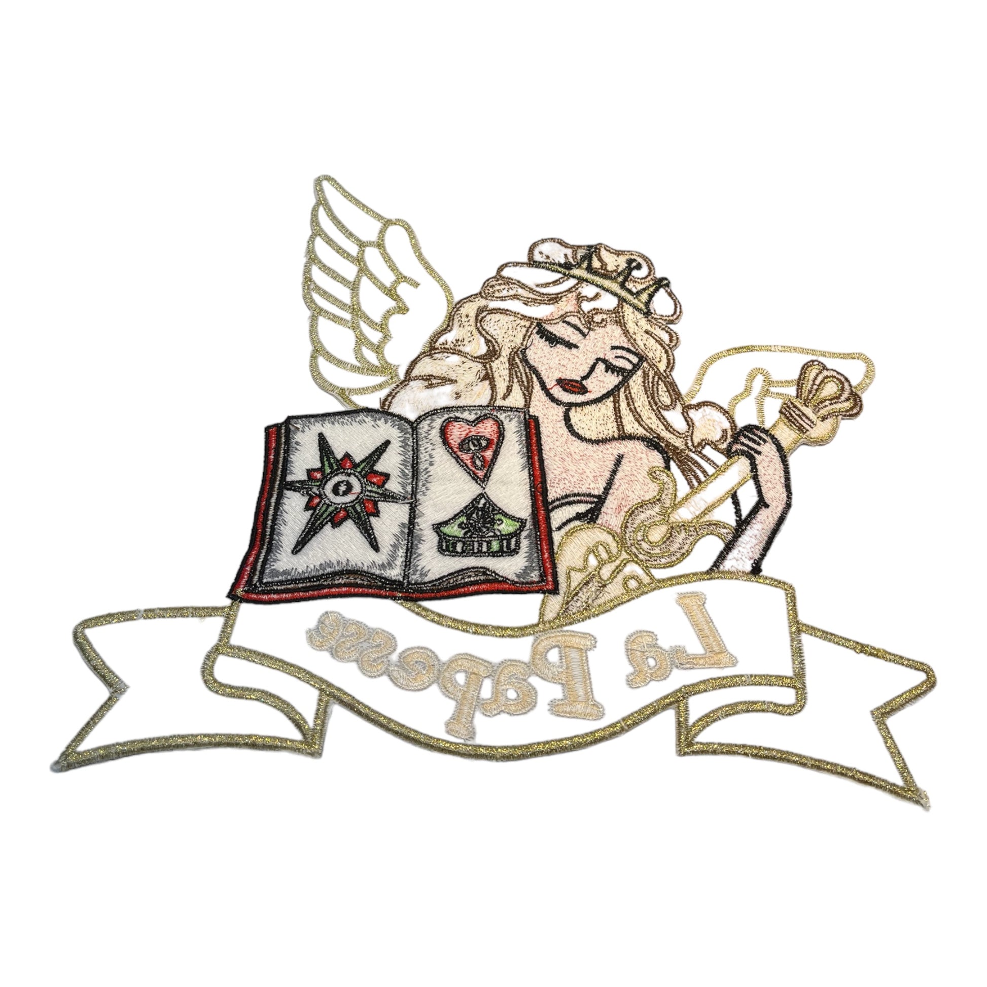 Este encantador parche bordado se presenta como una majestuosa Papessa desplegando sus alas celestiales con gracia.
