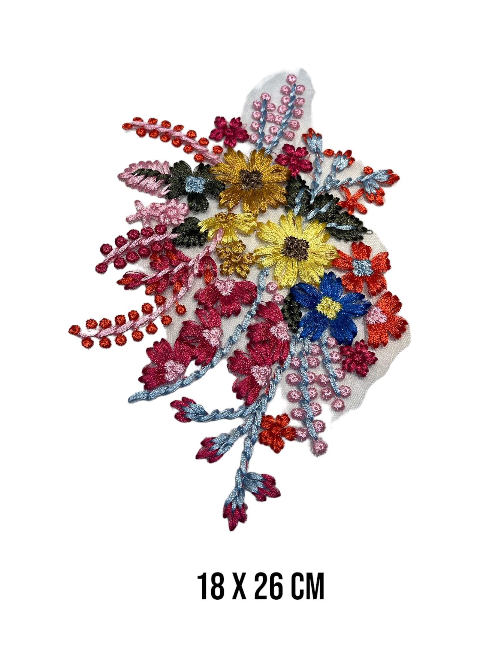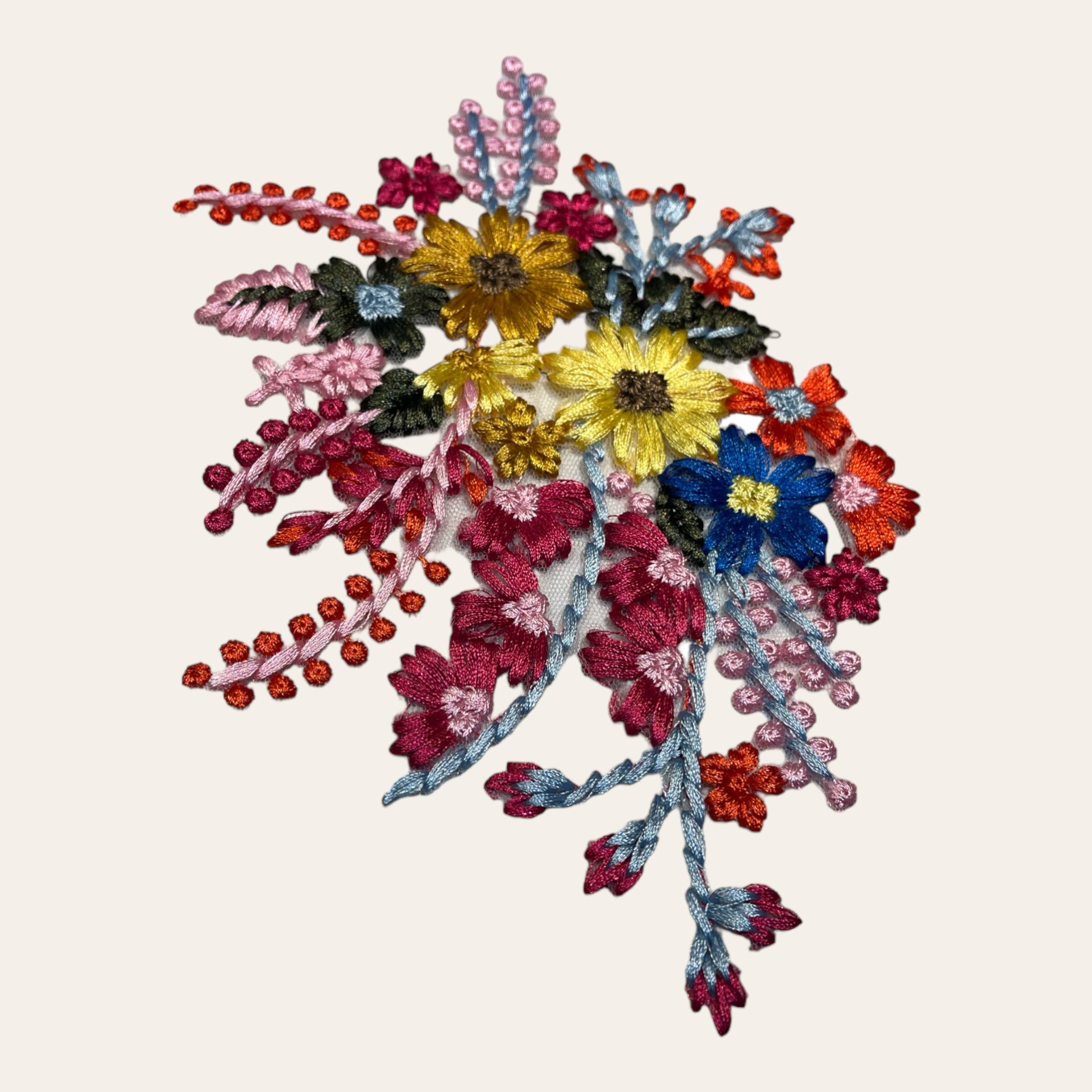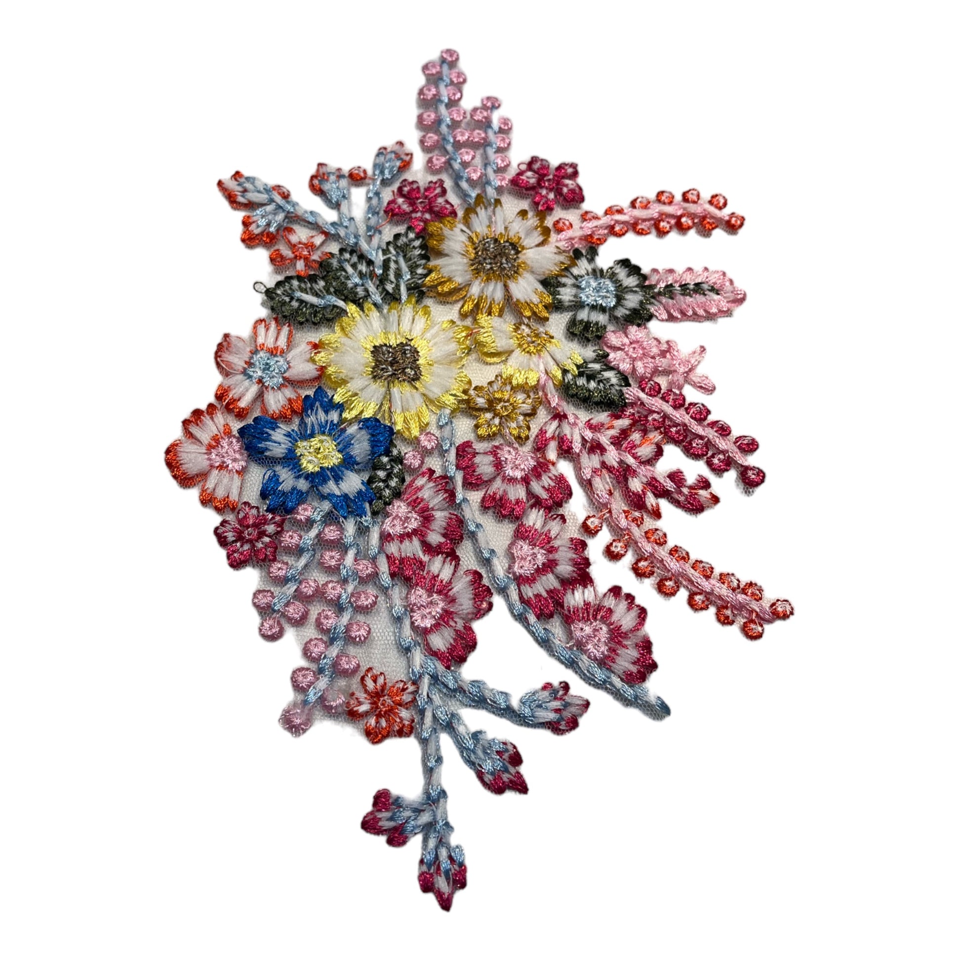 El aplique de flores de colores bordadas sobre tul es una exquisita pieza de decoración textil. Las flores, meticulosamente bordadas a mano están dispuestas en una variedad de tonos vibrantes que van desde suaves tonos pastel hasta colores brillantes y audaces