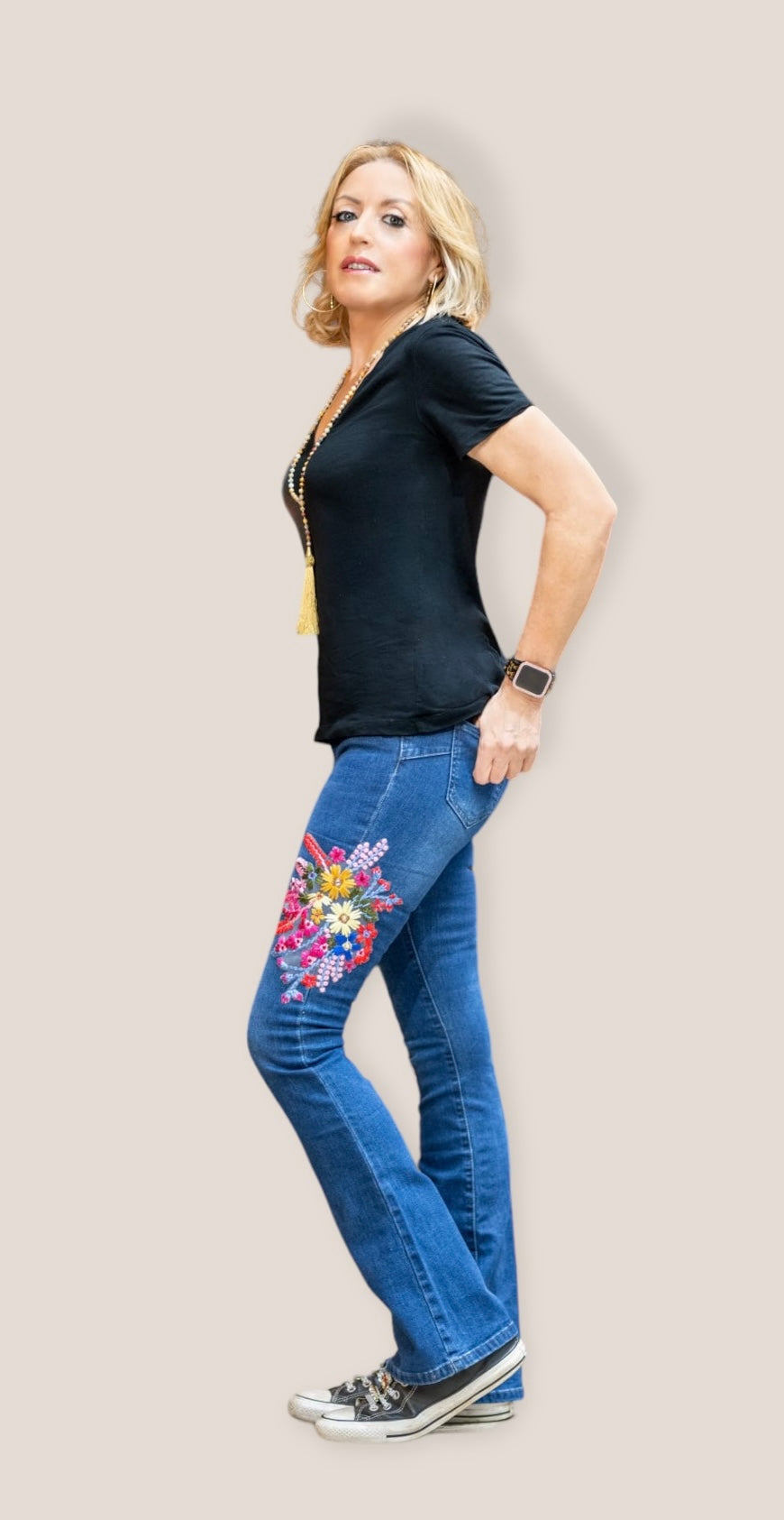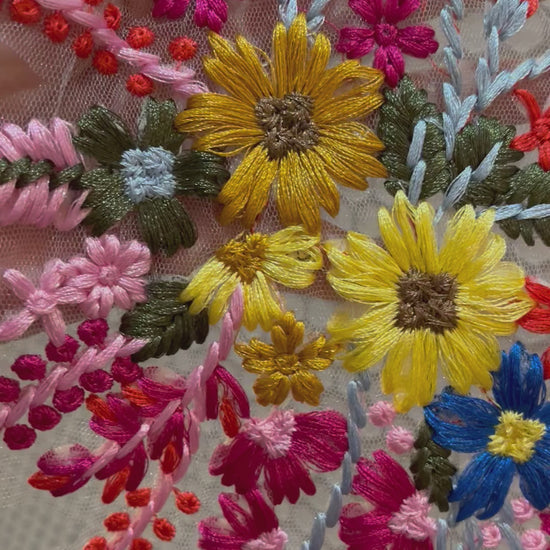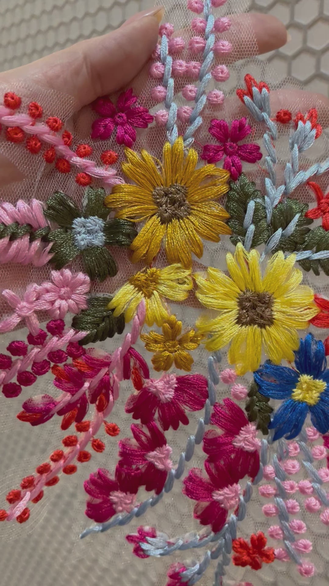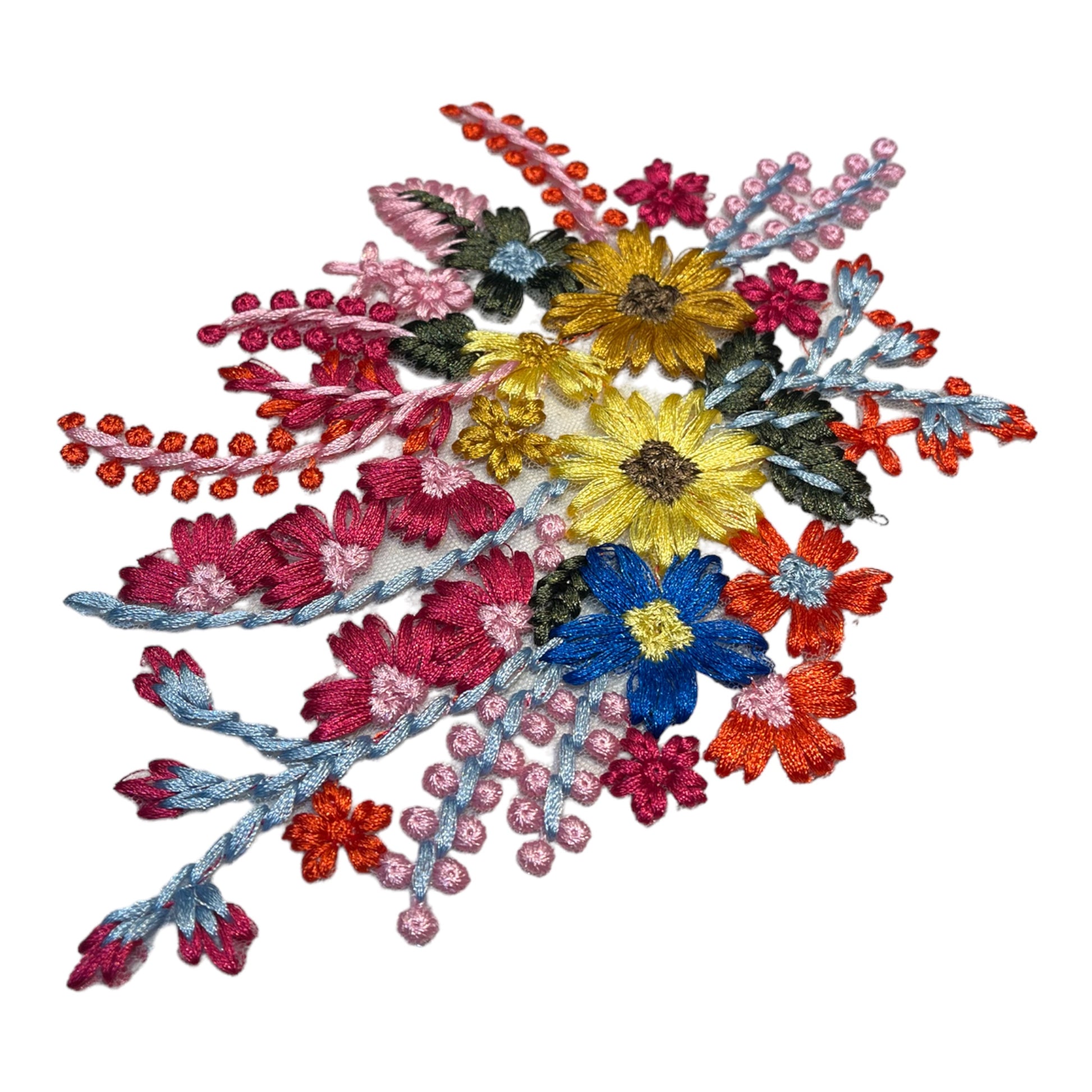 El aplique de flores de colores bordadas sobre tul es una exquisita pieza de decoración textil. Las flores, meticulosamente bordadas a mano están dispuestas en una variedad de tonos vibrantes que van desde suaves tonos pastel hasta colores brillantes y audaces