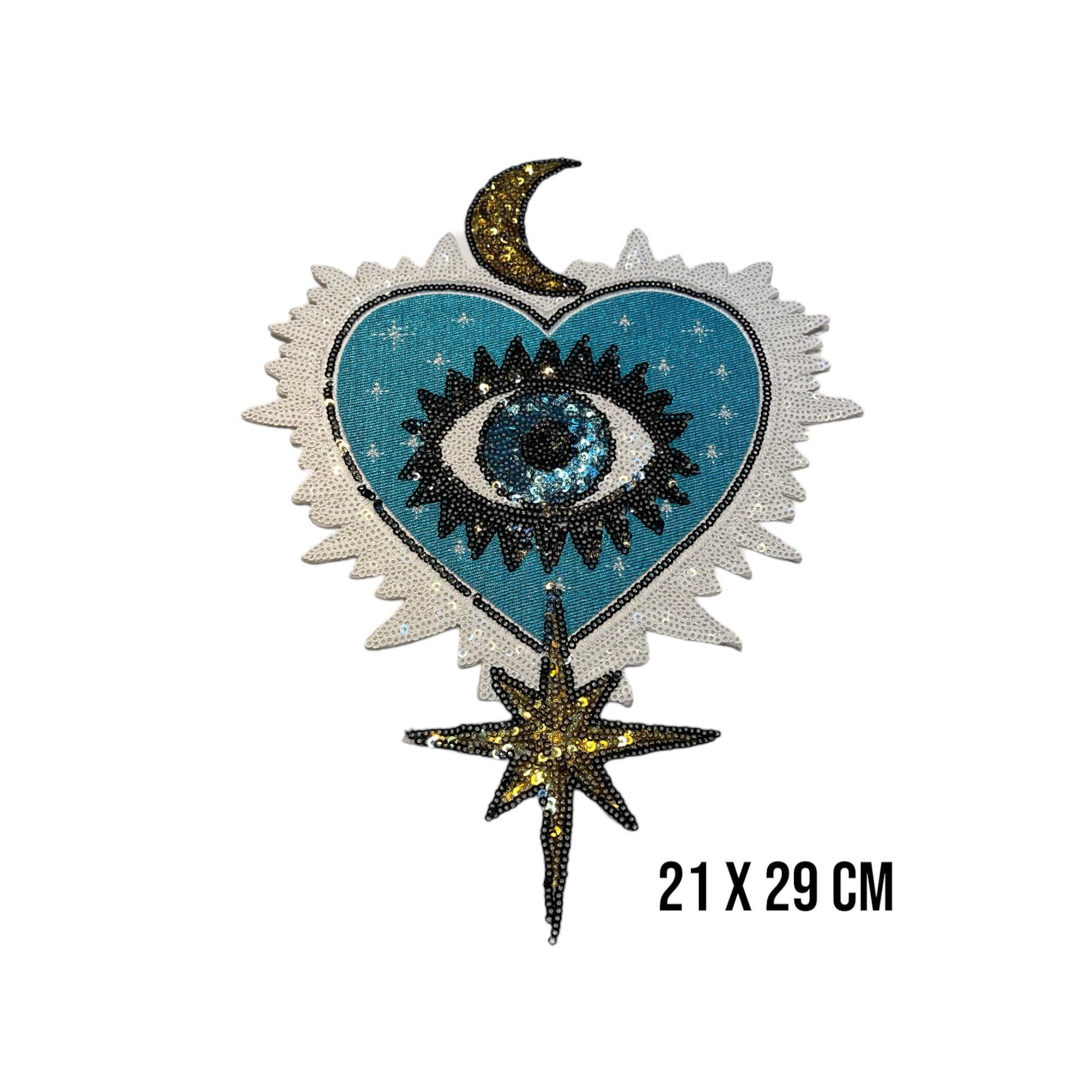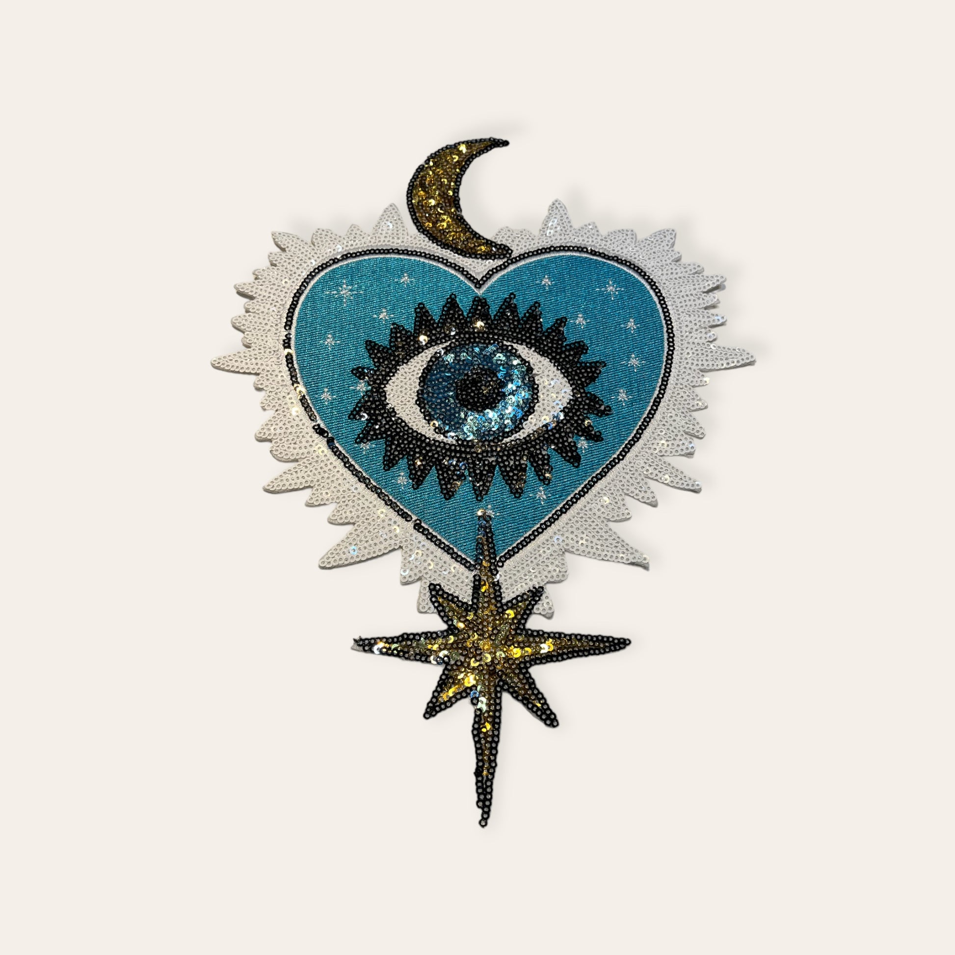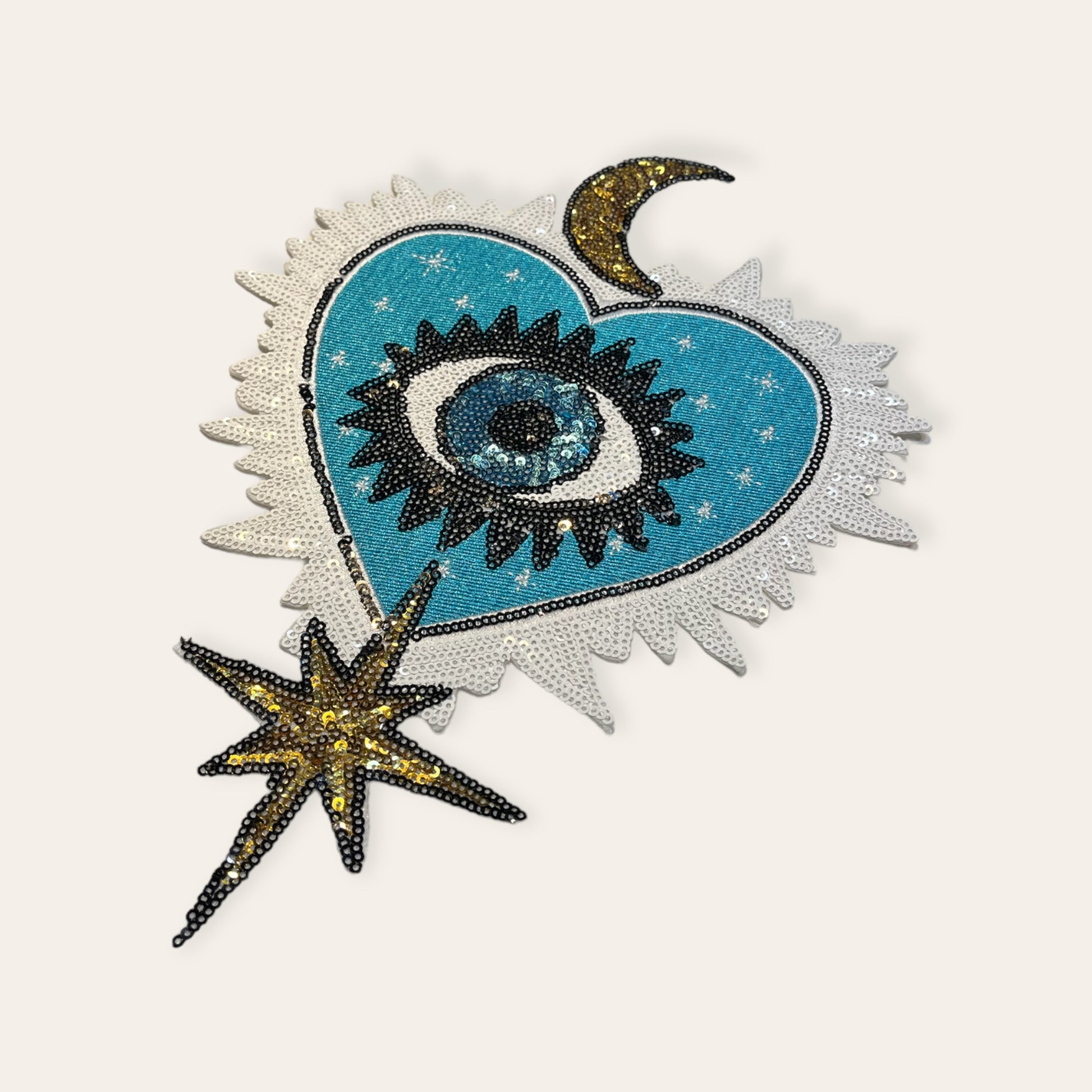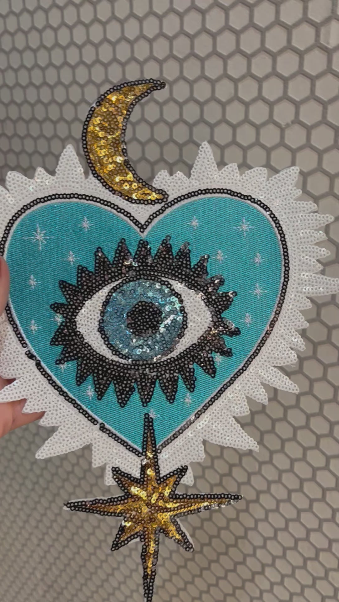 Confeccionado con lentejuelas, este parche refleja la luz de manera vibrante, destacando la mirada protectora del ojo. Una combinación única de elementos culturales y elegancia contemporánea, perfecta para añadir un toque distintivo a tus prendas o accesorios.