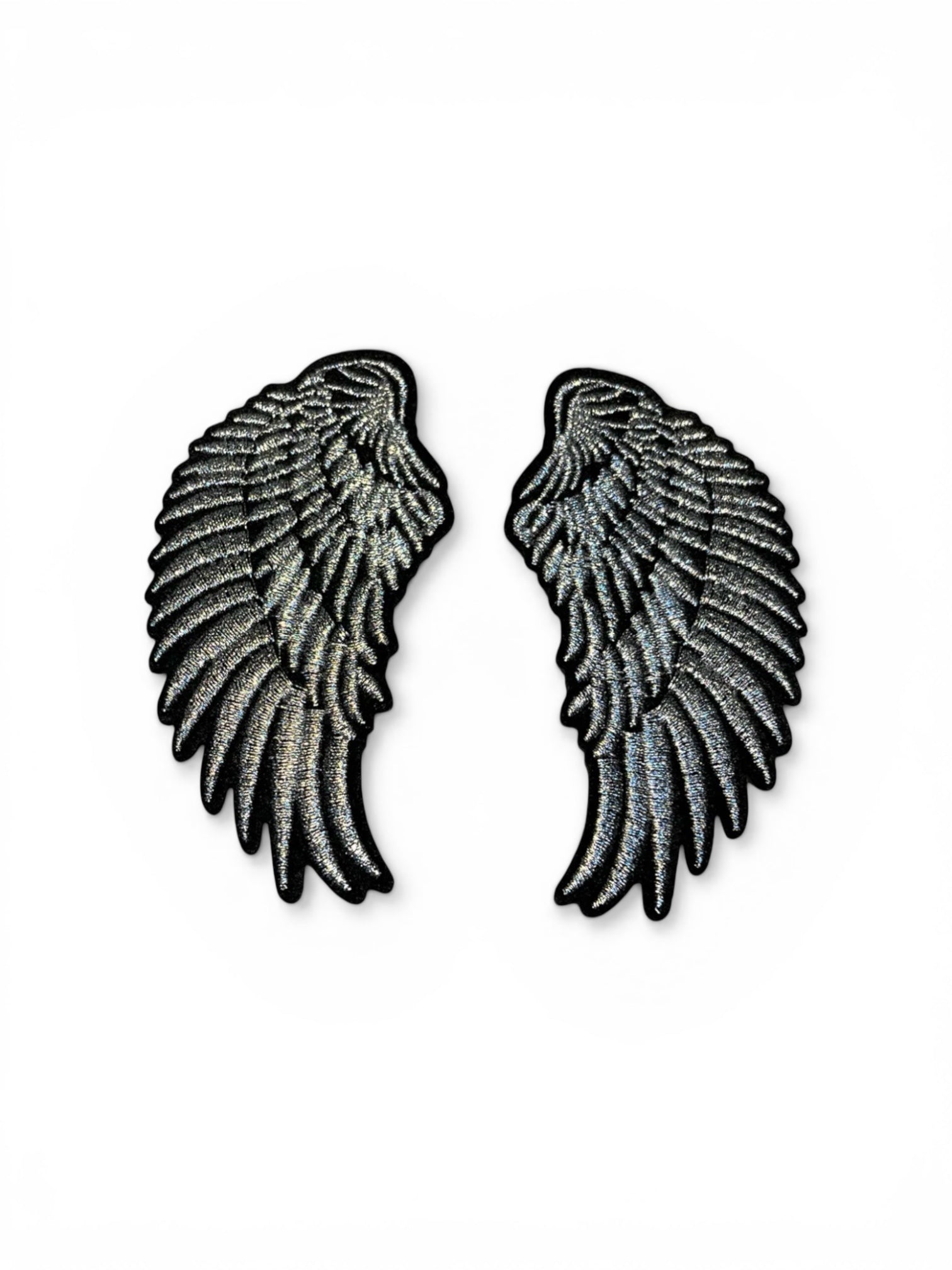 Un parche bordado en forma de alas generalmente presenta detalles intrincados con hilo metálico . Las alas pueden tener un diseño realista o estilizado, con texturas que resaltan la calidad del bordado.