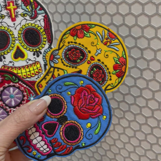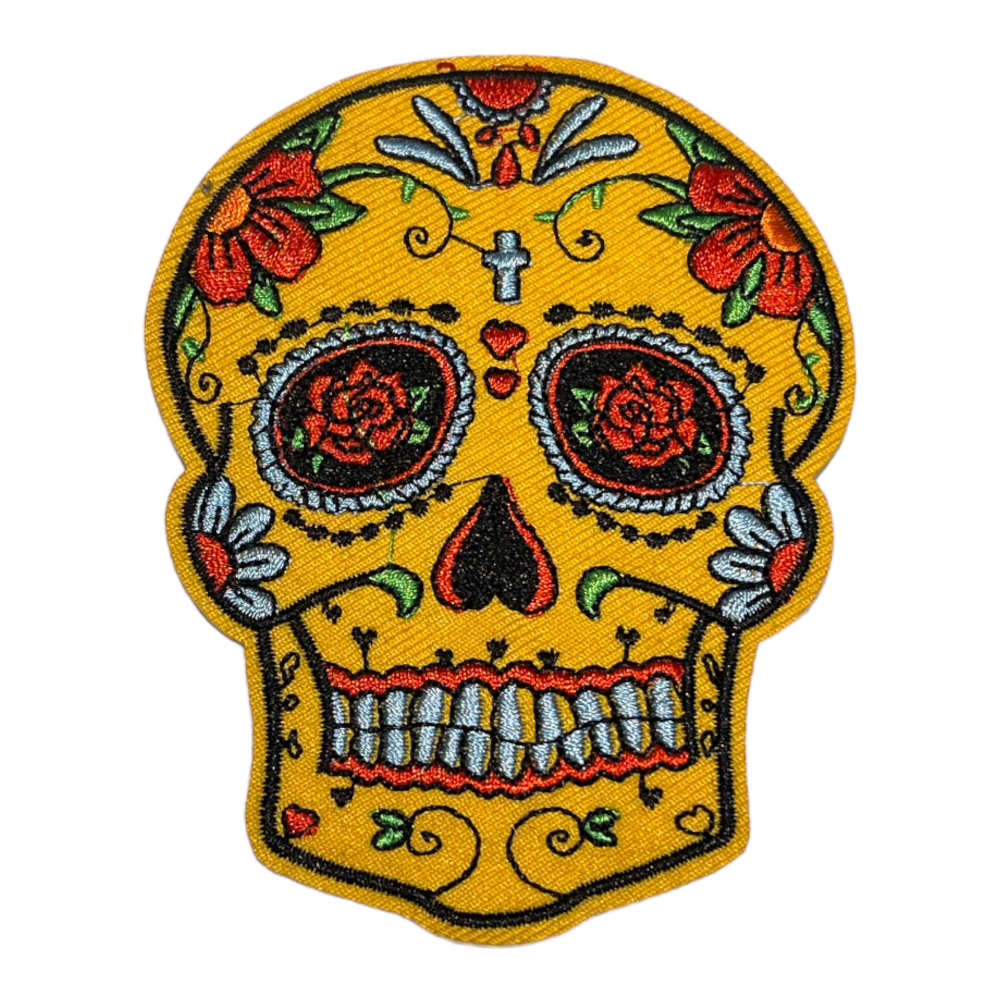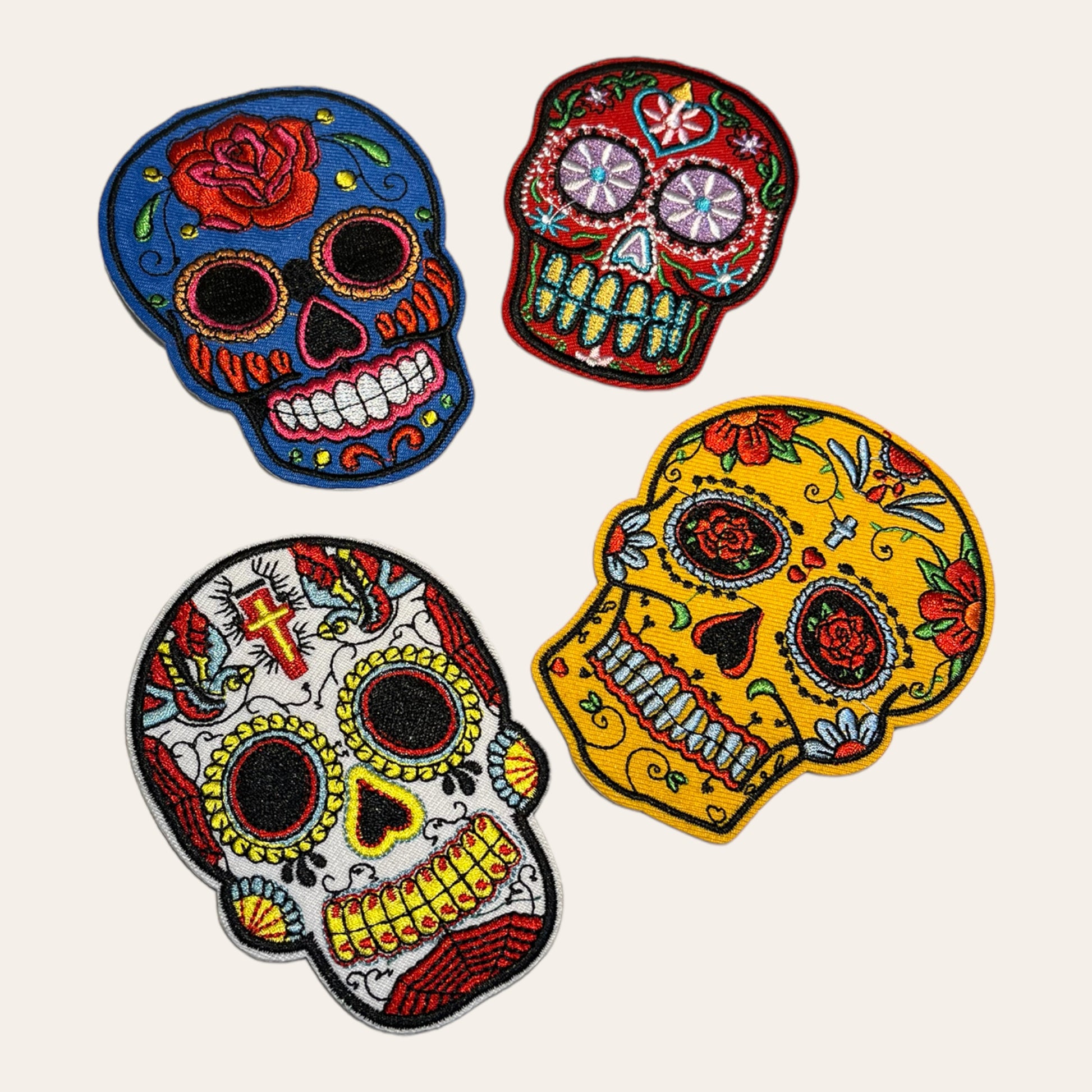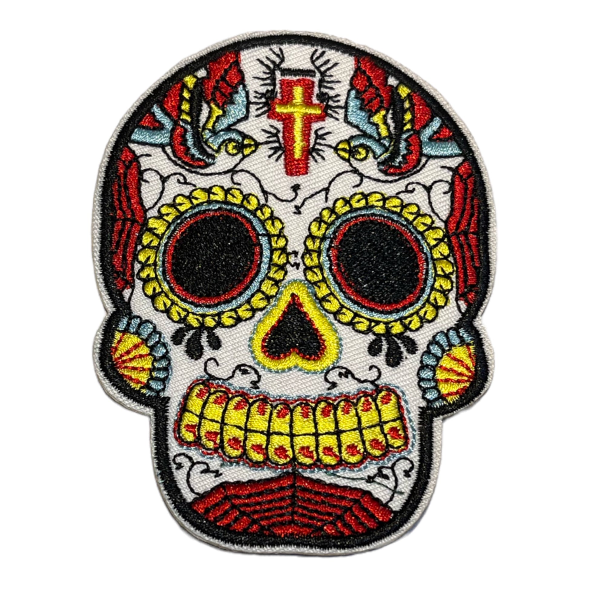 El parche presenta una calavera estilizada, a menudo adornada con detalles florales intrincados y colores llamativos. Los elementos florales, como margaritas o cempasúchiles, rodean la calavera, incorporando la influencia de la festividad del Día de los Muertos. Los tonos vibrantes, como el rosa, naranja, azul y verde, se combinan para crear una imagen alegre y festiva.