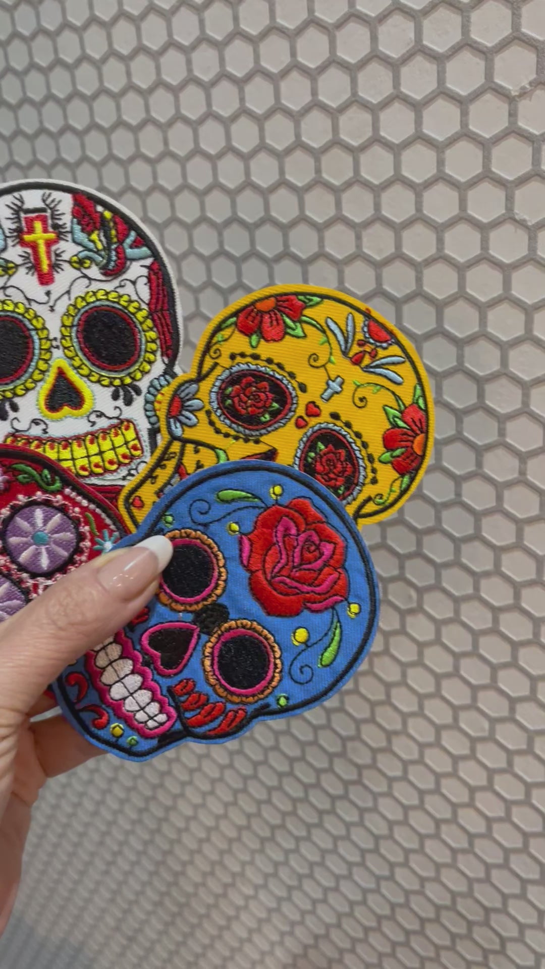 Un parche de calavera mexicana es típicamente una pieza vibrante y colorida que representa la tradicional calavera mexicana, conocida como "calaca" o "calavera catrina". Aquí tienes una descripción: