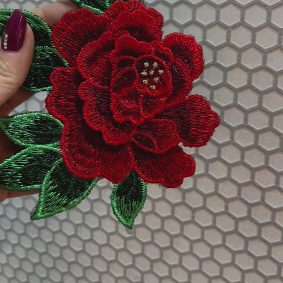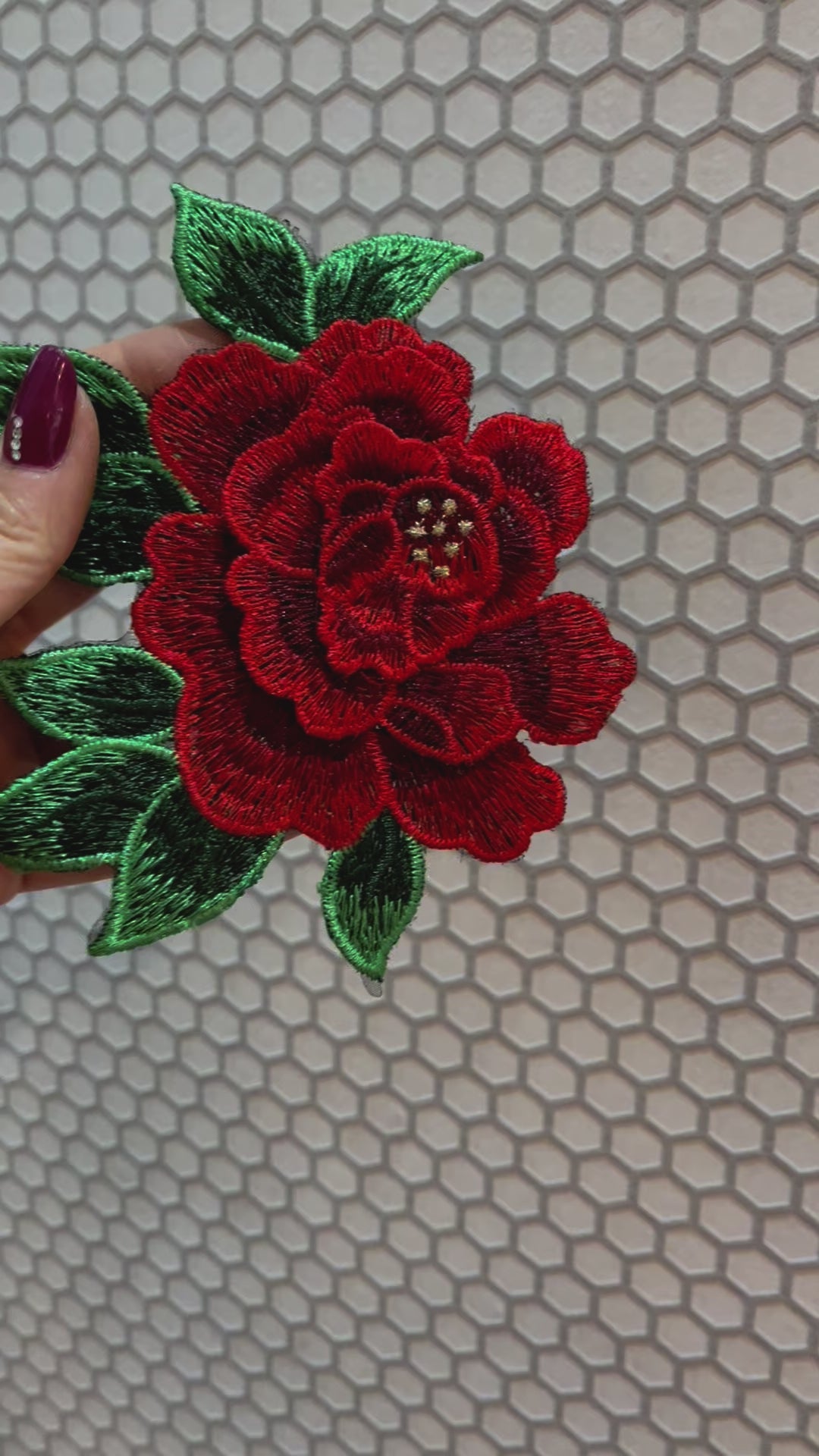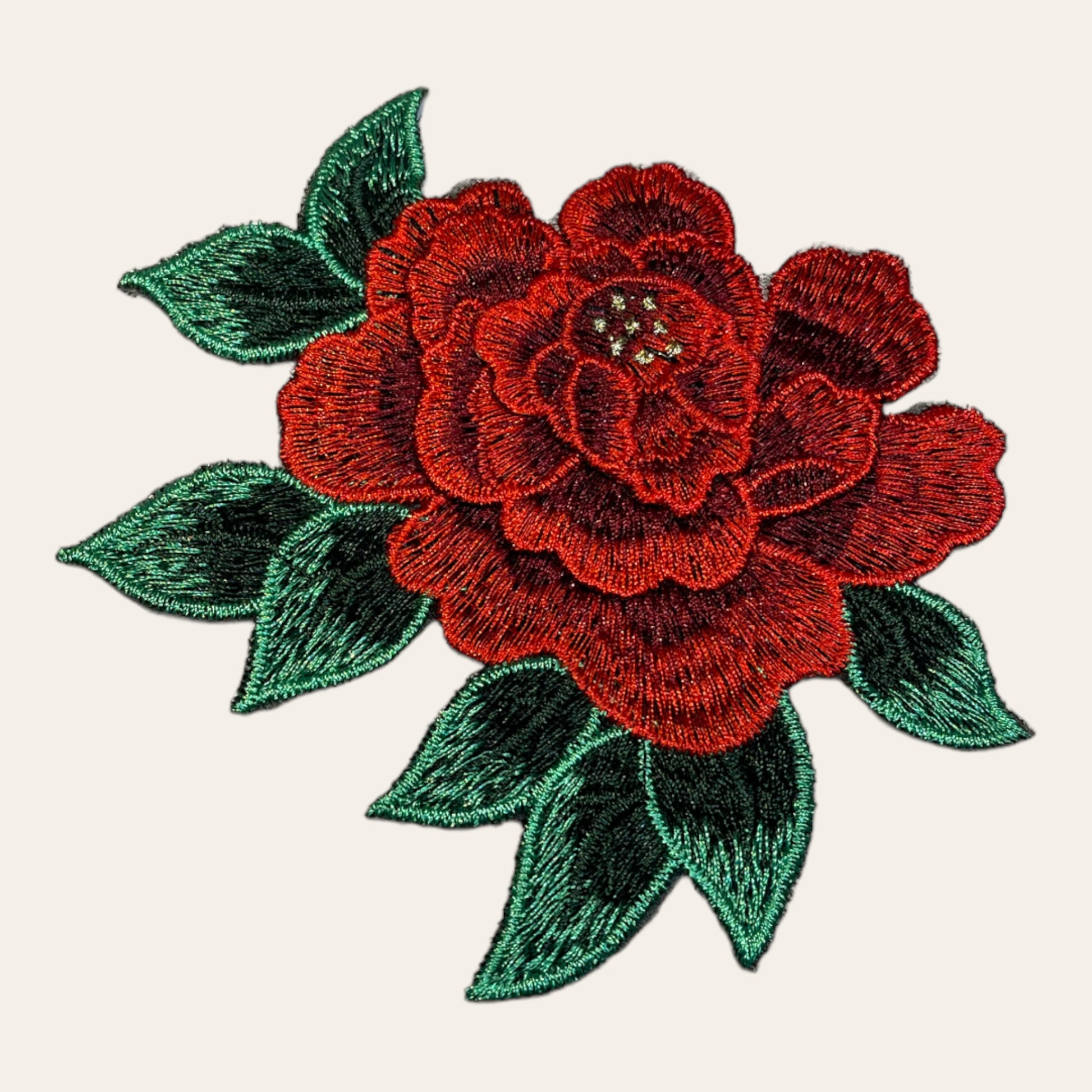 El parche bordado en forma de flor roja presenta pétalos delicadamente trabajados, con tonos vivos que evocan la intensidad y la belleza natural de la flor.