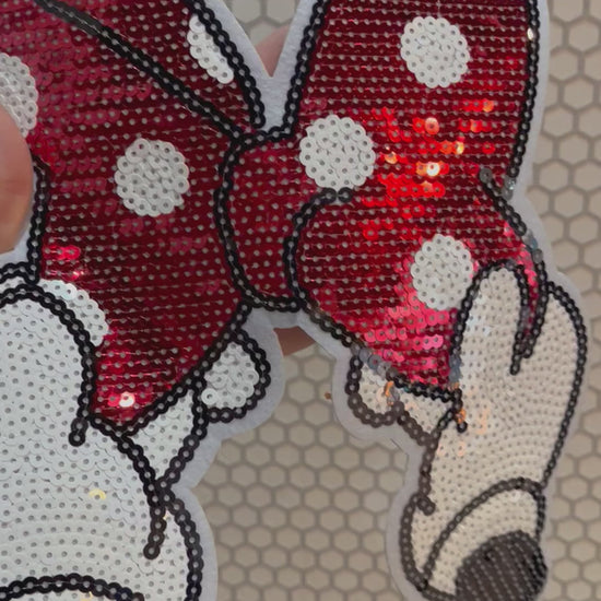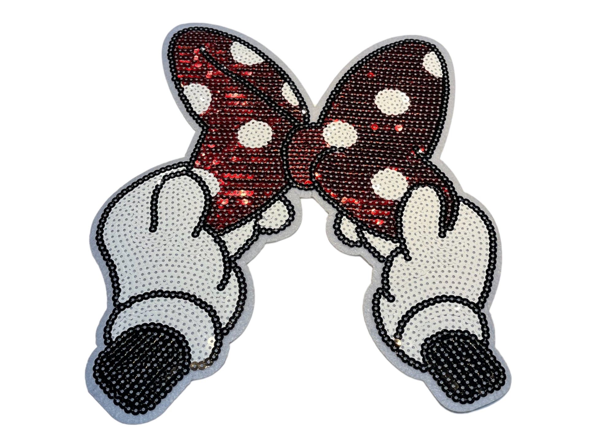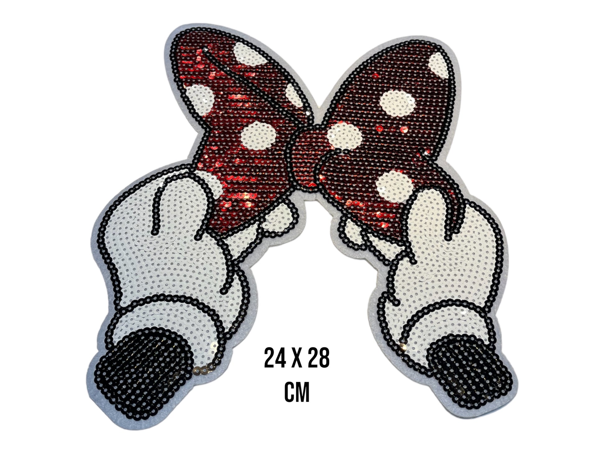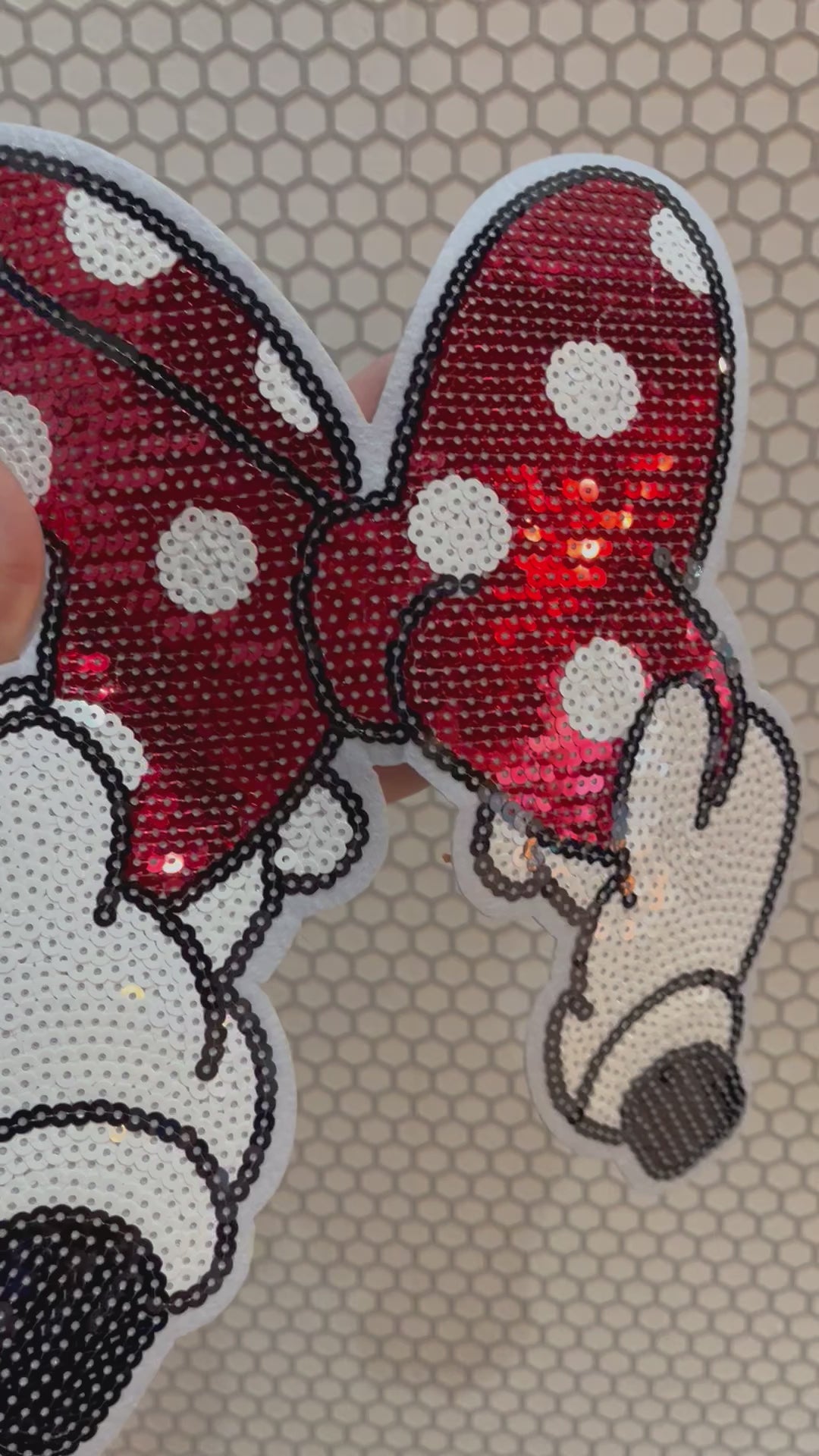 El parche de lazo de Minnie con lentejuelas es una encantadora pieza que captura la esencia juguetona y elegante del icónico personaje.