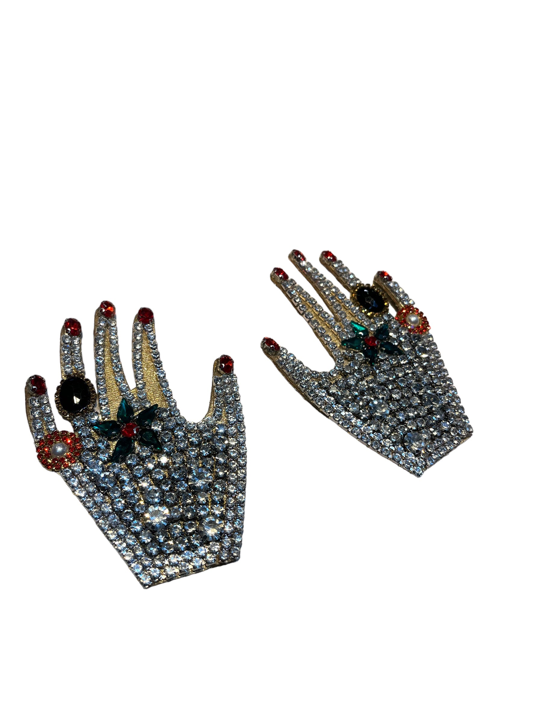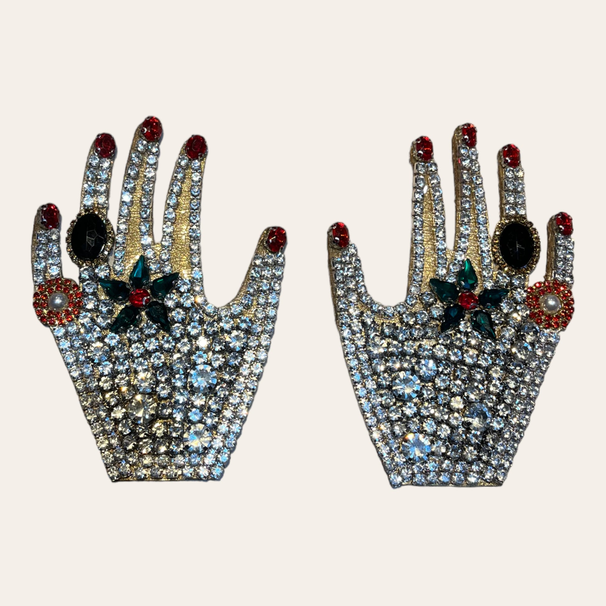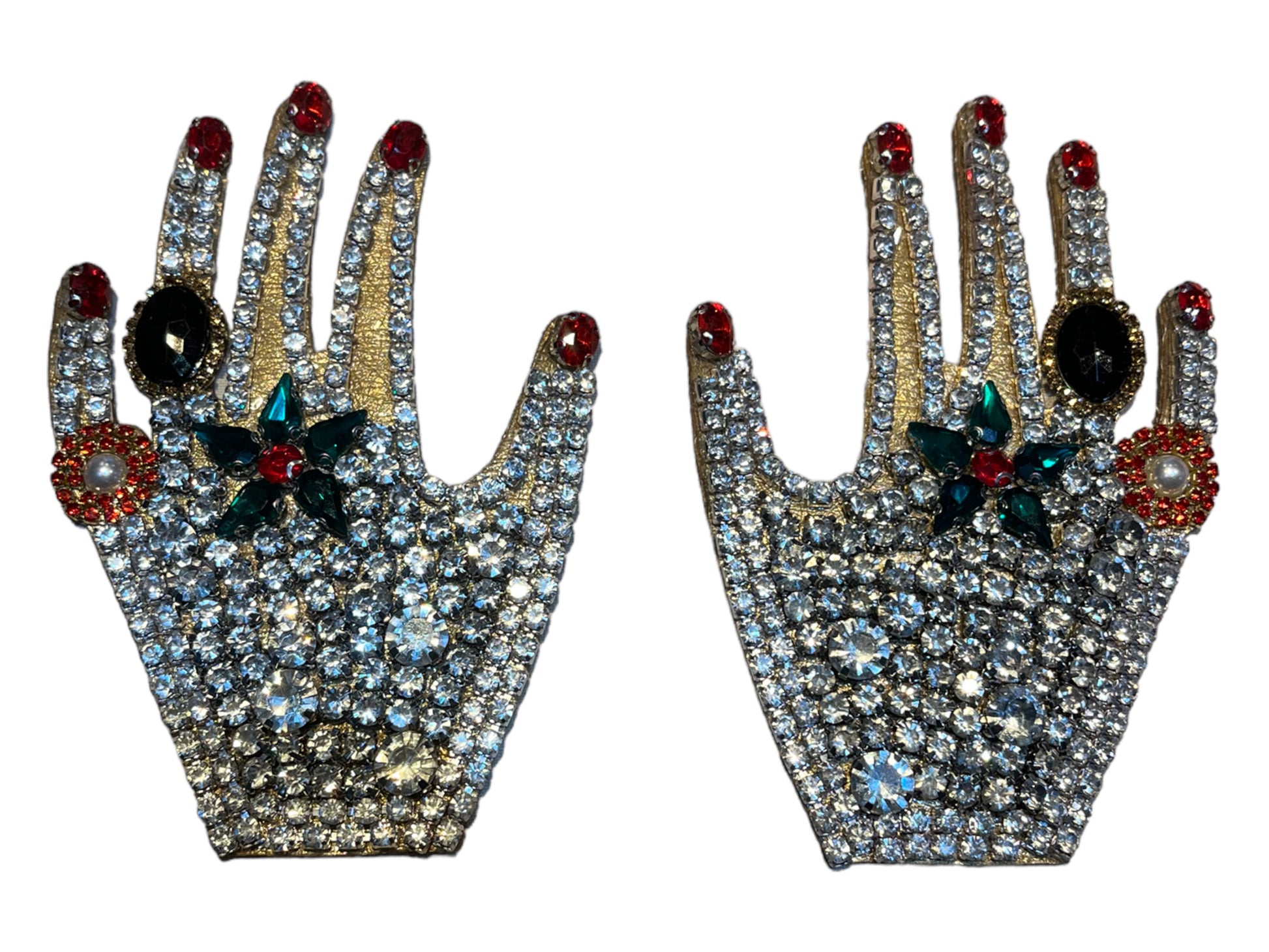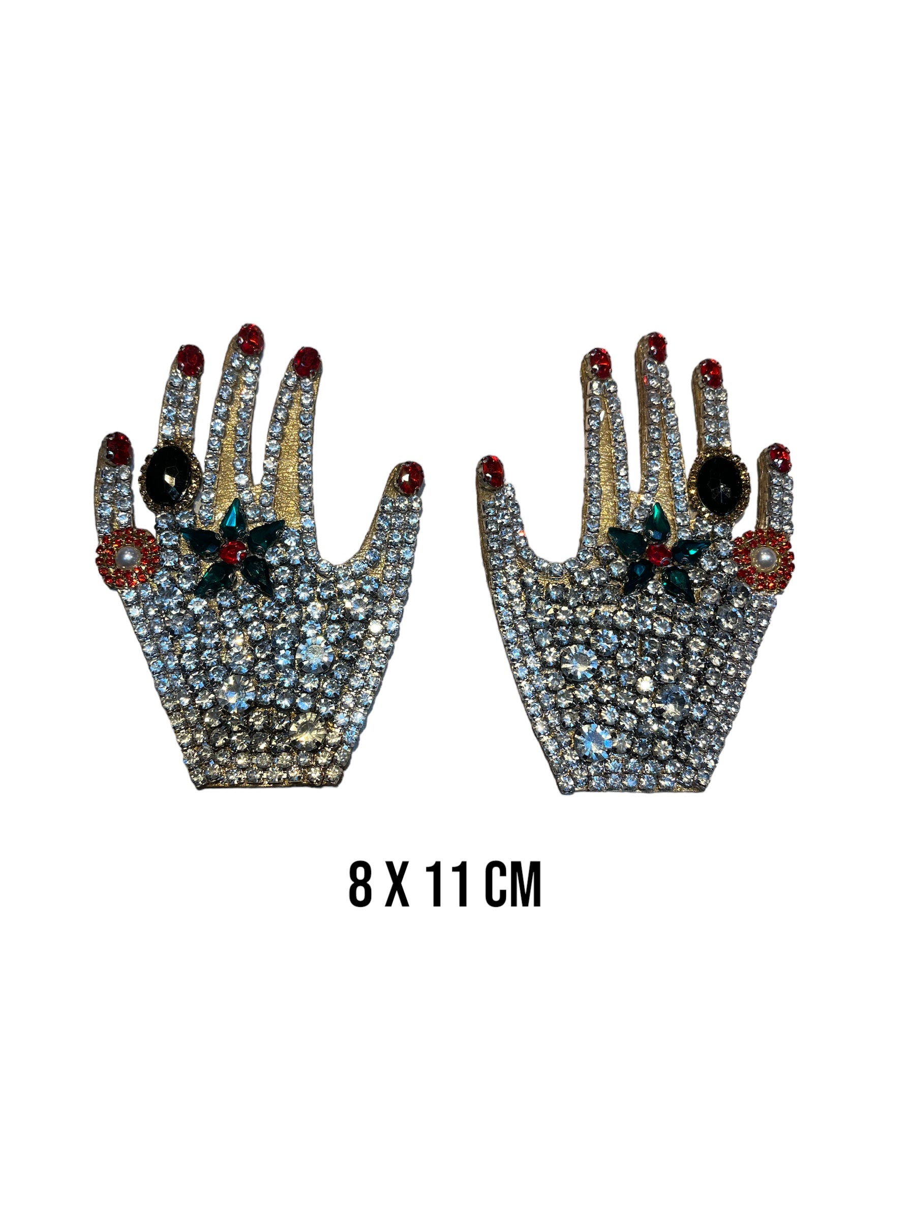 Un parche de pedrería en forma de manos que es una aplicación decorativa que presenta detalles elaborados con pequeñas piedras brillantes y diferentes cristales de colores formando la imagen de las manos.