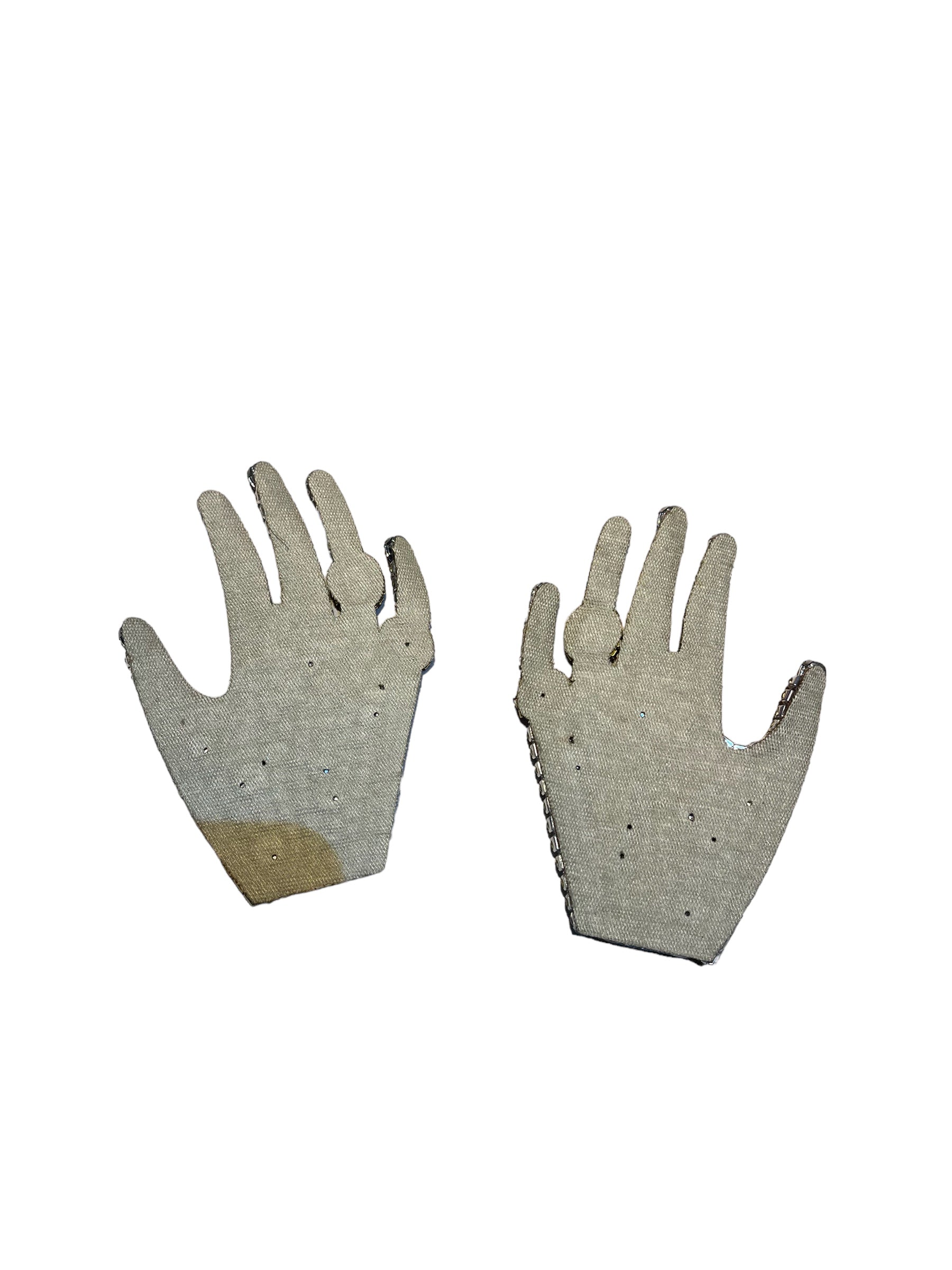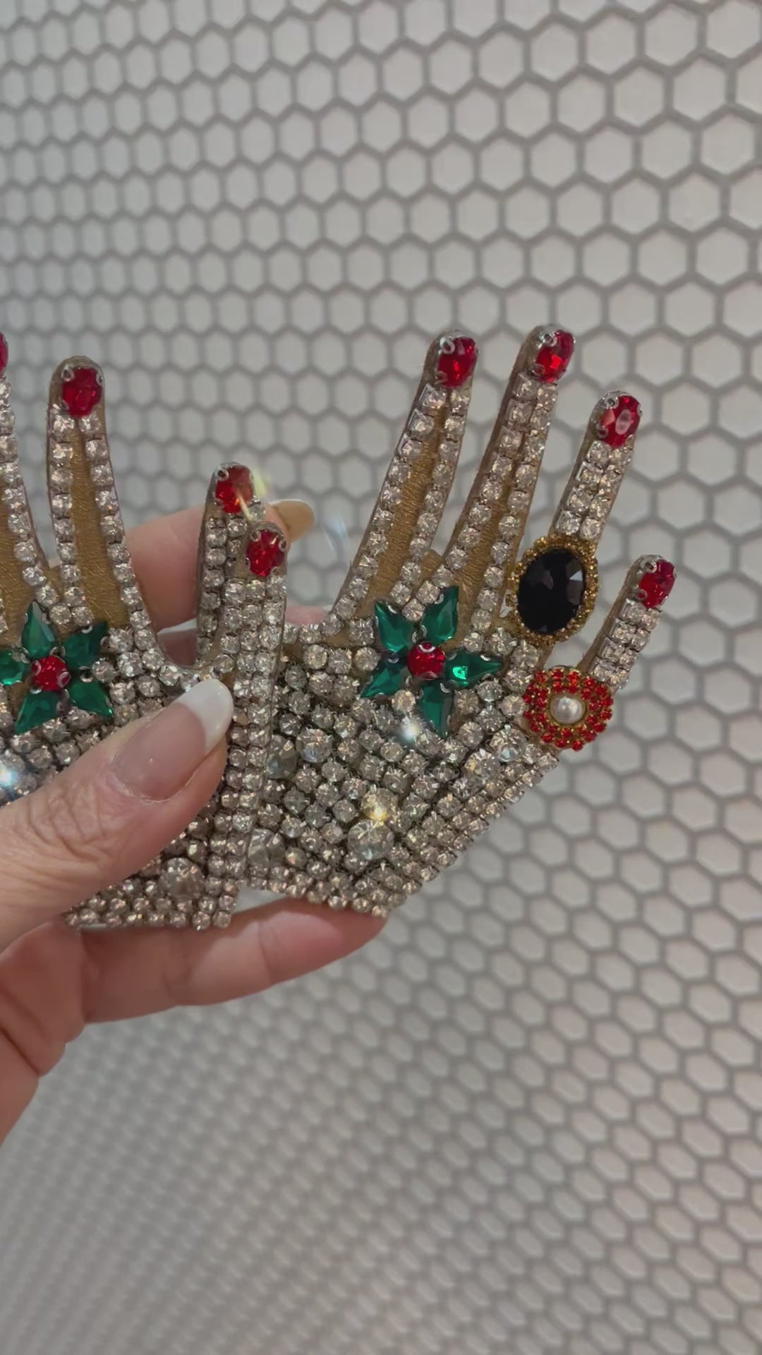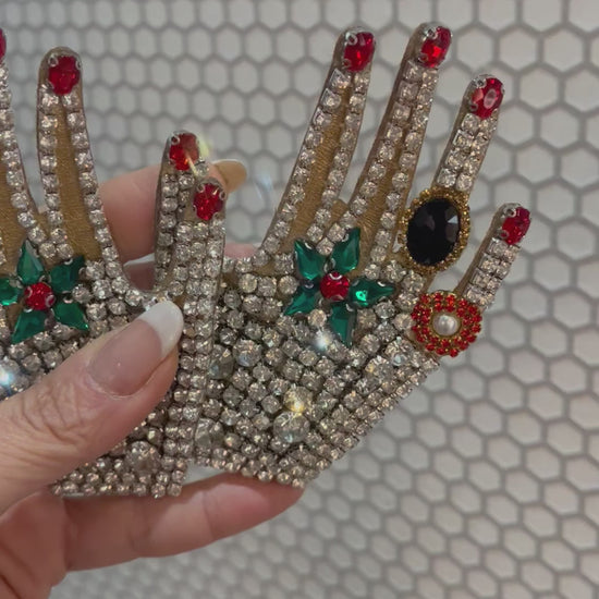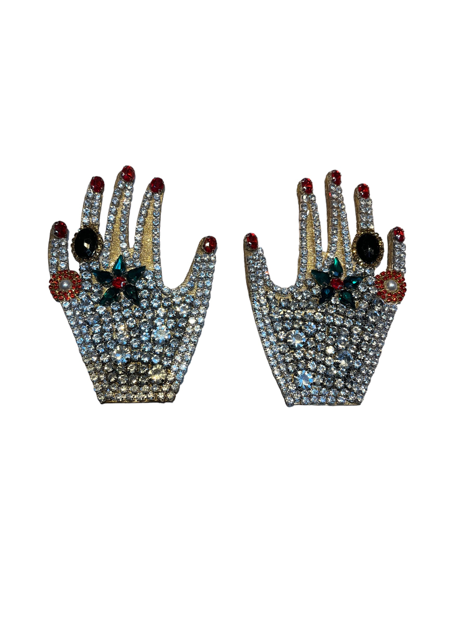 Un parche de pedrería en forma de manos que es una aplicación decorativa que presenta detalles elaborados con pequeñas piedras brillantes y diferentes cristales de colores formando la imagen de las manos.