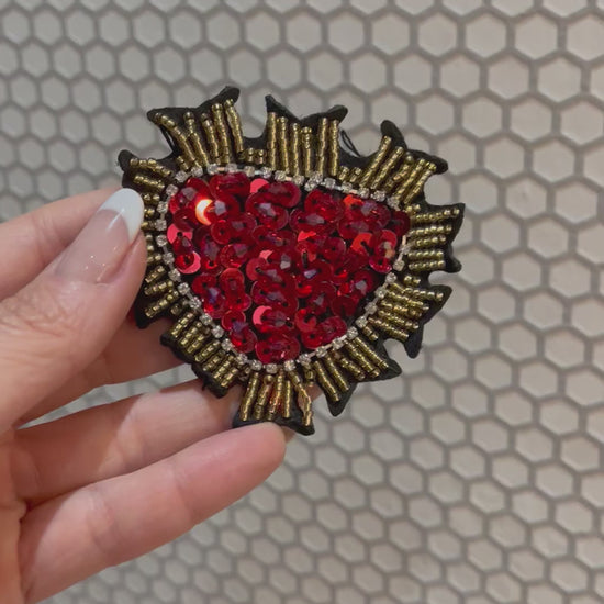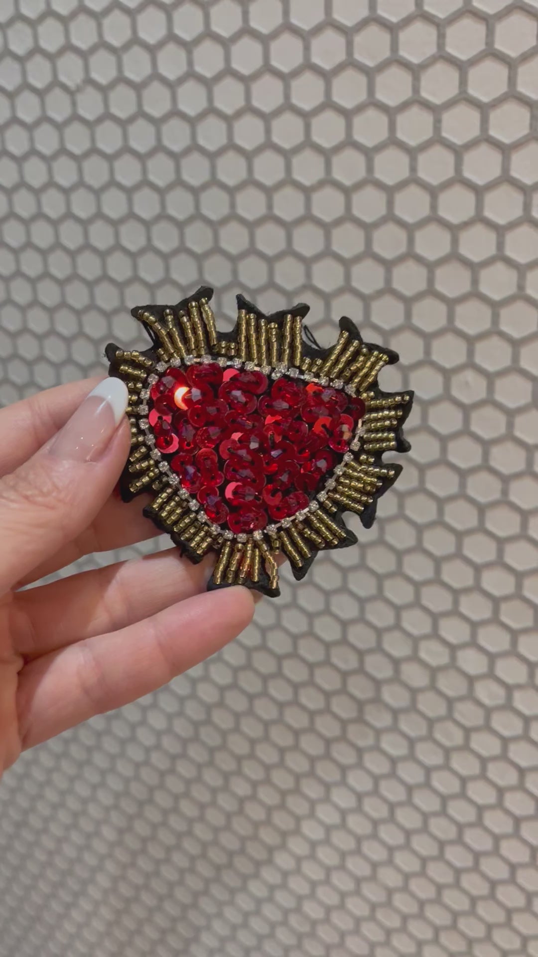 Este pequeño pero impactante parche Sagrado Corazón, confeccionado con esmero artesanal, destaca por la brillantez de las lentejuelas y abalorios.